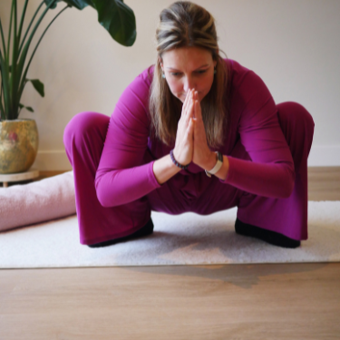 Kom staan met je voeten op heupbreedte. Buig vervolgens je knieën en kom tot hurkzit. Mocht je niet met je voeten plat op de grond komen dan kun je een opgevouwen deken gebruiken. Plaats je handen vervolgens voor je borst samen en geef licht druk met ellebogen tegen je knieën.